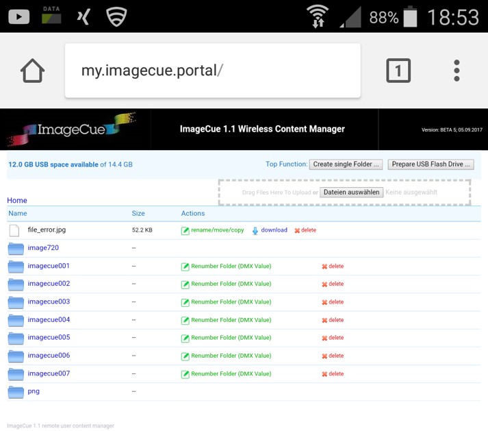 After connecting to the WiFi, this compact device serves a secure file browser that enables users to upload their content to ImageCue’s USB drive. After the content is uploaded, ImageCue allows users to copy, move, or rename it.